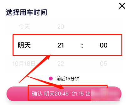 3、点击底部左侧的“时钟”图标,选择用车时间,点击“确认”。