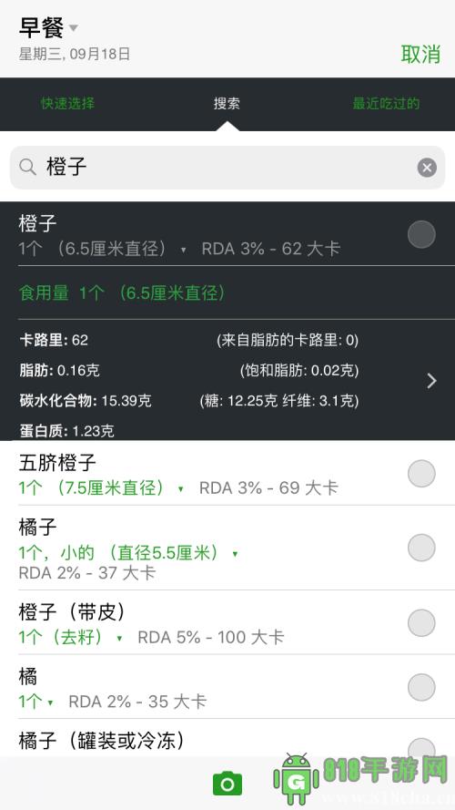 7、当然你的食物的能量来源可以更加具体一点,商场中各式各样的食物,都可以查到。比如一个橙子,它的卡路里,脂肪,碳水化合物等的含量都可以查到。