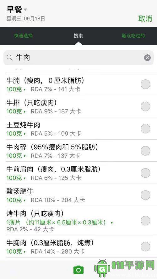 6、它还可以告诉你,同一种食品,怎样制作或者是怎样吃卡路里更少,烤制,脱脂,切片状则能将牛肉的卡路里尽可能的降到最低。非常的详细,只要你肯花功夫,你就能得到最优的一餐饮食,获取适当的能量。