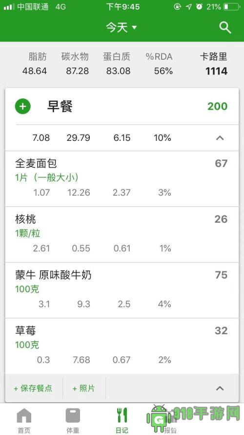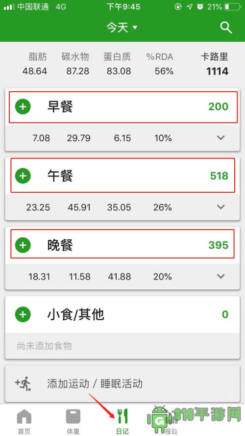3、点击日记,能够清晰地显示出早餐午餐晚餐的脂肪、碳水化合物、蛋白质、%RDA、卡路里等等,另外你还可以添加小食,零食的信息摘要。它还会帮你显示出各餐卡路里所占一天三餐的卡路里百分比。