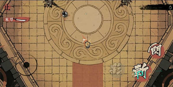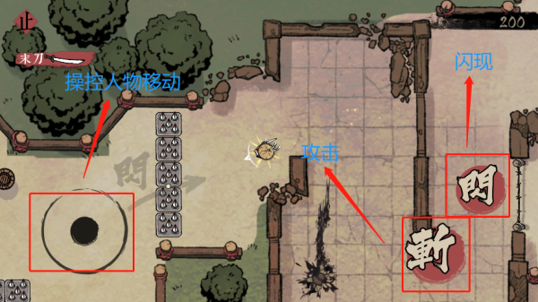 3、简洁的游戏界面,牛皮纸风格一般的场景地面上,除了场景元素外就只有我们和刀光剑影。