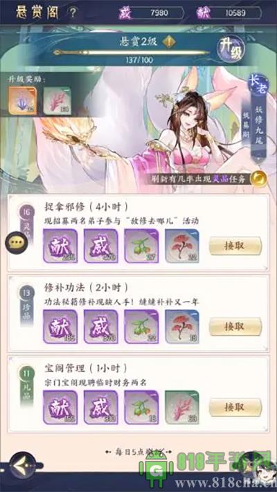 方法:宗门中的悬赏阁每日可以接取到若干悬赏,道友需要派遣符合要求的妖灵并经过一段时间才能完成,建议道友提早进行派遣,这样晚些时候就可以来收菜啦。