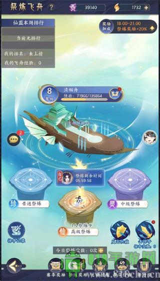 玩法说明:进入飞舟可选择普通、中级、高级祭炼,期间可入侵其他仙盟处于祭炼状态玩家,也可反击前来掠夺的玩家,完成祭炼可获取资源,每日18:00-21:00为奖励时间,期间进行祭炼可获取额外奖励加成。