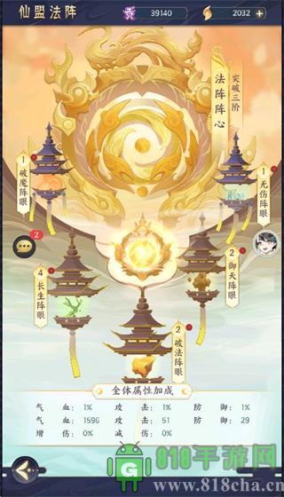玩法说明:使用从仙盟玩法中获取的法阵材料进行阵眼的升级,获取相应的属性加成,消耗法阵核心进行阵心升级,可提高阵眼等级上限,增加百分比妖灵属性。