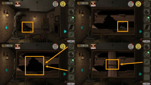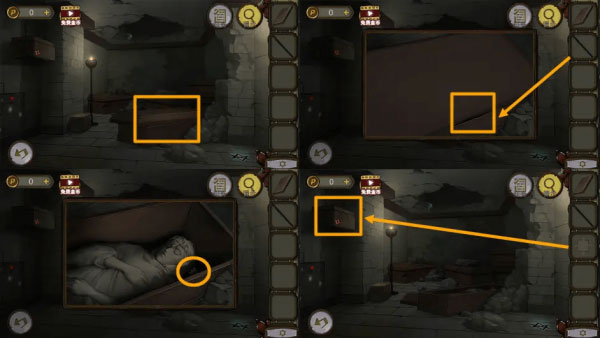 3、用【长棍子】撬开棺板,拿到【拼图块】。用【拼图块】启动拼图机关,解开拼图机关,拿到【钥匙】。